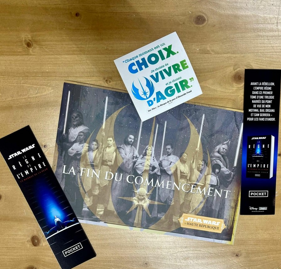 - Pocket se mettra aux couleurs de l’Empire et de la Haute République en lien avec leurs dernières sorties, avec un set marque-pages + sticker Le Règne de l’Empire : Le Masque de la peur, un ex-libris Haute République et un très beau poster avec l’ordre de lecture définitif des 3 phases. Chaque item est fourni avec un roman Pocket acheté sur le stand de la librairie.